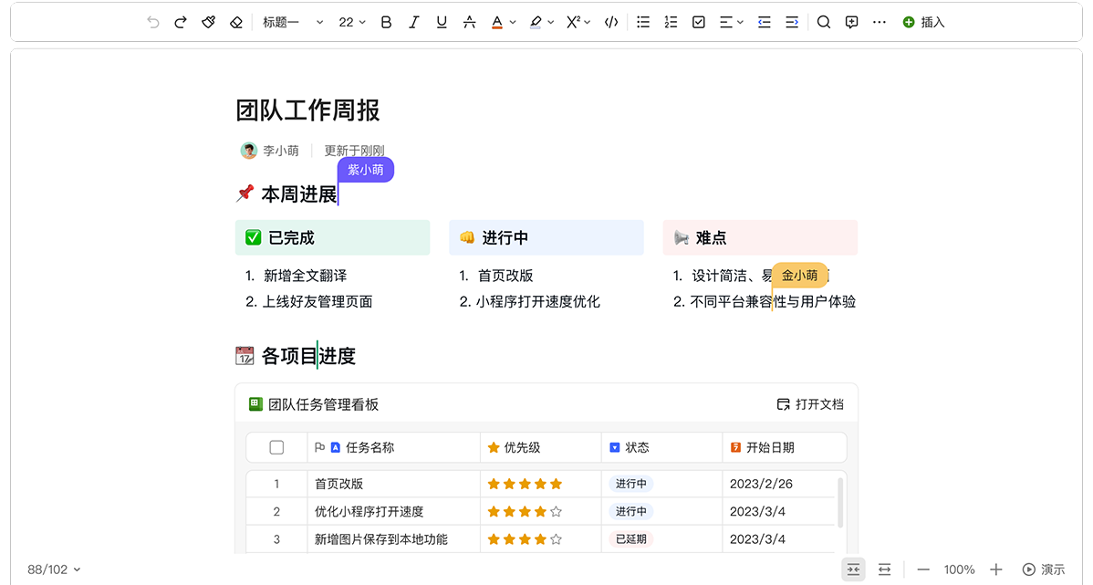 实时协作编辑,多人同时查看与修改,文档版本自动保存